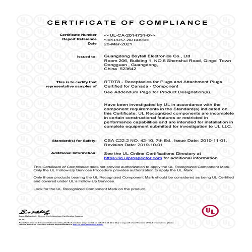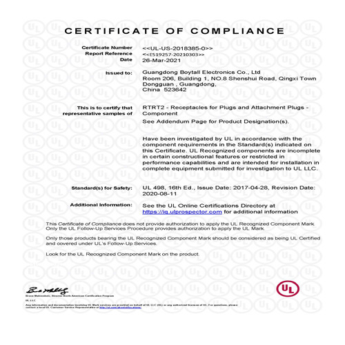 發(fā)布時間:2021-4-28 16:28:43 | 信息來源:廣東博滔電子有限公司美式二孔最新UL認(rèn)證如下圖: